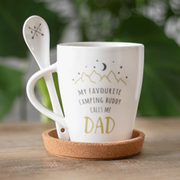 A sweet mug and spoon set made just for Dad. Features a starry mountain sky design with ‘My favourite camping buddy calls me dad’ text, making it perfect for Father’s Day and birthdays. Includes a matching teaspoon with a compass design that fits perfectly in a slotted handle. 500ml capacity. Dishwasher and microwave safe. Product Dimensions: H10cm x W11.5cm x D8.5cm Packaged Dimensions: H10.5cm x W11cm x D9cm.