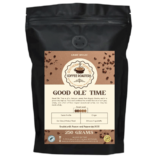 Good Ole’ Time is of a Heirloom variety from Negele Gurbitu and it is grown very high up. This blend combines the notable flavours of earl grey, whisky, and a hint of floral. Expect exceptional coffee. Earl Grey tea meets whisky.