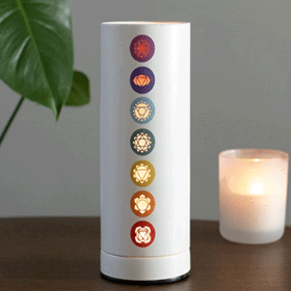Electric aroma touch lamp featuring the symbols of the Seven Chakras making it a perfect accessory for meditation spaces and relaxation areas. Add a few drops of fragrance oil to the water well inside and tap the lamp to turn it on and start releasing beautiful scents.