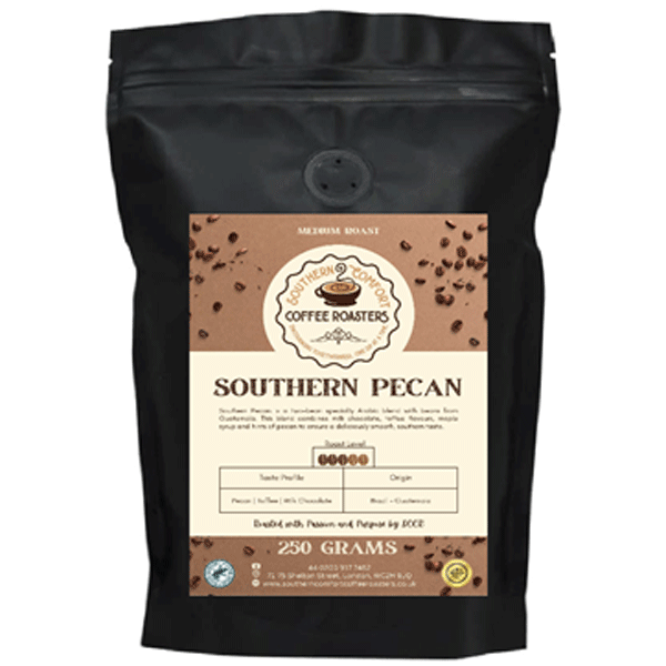 Southern Pecan is a two-bean specialty Arabic blend with beans from Guatemala. This blend combines milk chocolate, toffee flavours, maple syrup and hints of pecan to ensure a deliciously smooth, southern taste.