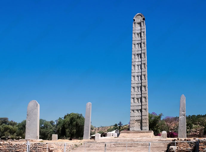 The Obelisk of Axum is a 4th-century CE, 24-metre tall phonolite stele, weighing 160 tonnes, in the city of Axum in Ethiopia. It is ornamented with two false doors at the base and features decorations resembling windows on all sides. The obelisk ends in a semi-circular top, which used to be enclosed by metal frames.